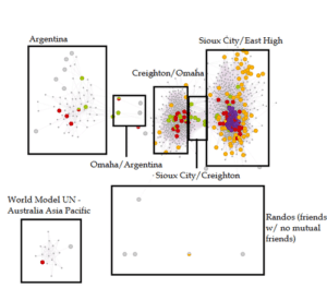 It groups my friends by how they are connected to my other friends, and the sizes are pretty well proportional to how much time I spent where. Sioux City/East High has the largest volume, since I grew up there from 4th grade to high school graduation. Creighton/Omaha has less people but it is a lot more dense since the people I know here are usually more well-connected to each other in a tight-knit university community. Argentina can be split into a couple sub-categories, the US friends I met in el país (more densely grouped together in the center) non-US, non-Argentine friends I met allá (mostly European, also in the center but a little more spread out), and actual Argentine people, about the same volume of the other sub-categories but spread out along the fringes of that network. Then there are the people I met at World MUN, Melbourne and the random people that have no or almost no mutual friends to me. The most interesting groups are probably the inbetweeners. There were a couple of people I randomly met in Argentina who happened to know some people that go to Creighton, and there are of course the Sioux Cityers who also go to my university. I think it’s really cool how a computer program can know this about me, not by looking up where they live geographically, but by who is connected to whom.
